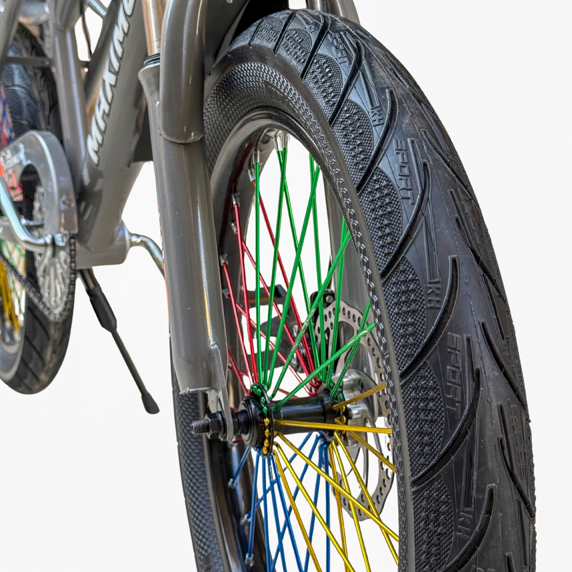 The bike comes equipped with a powerful disc brake system, ensuring strong stopping power and full riding control. The 300-size tires offer excellent stability on the road, while the colorful spoke design gives the bike a unique and stylish appearance.
