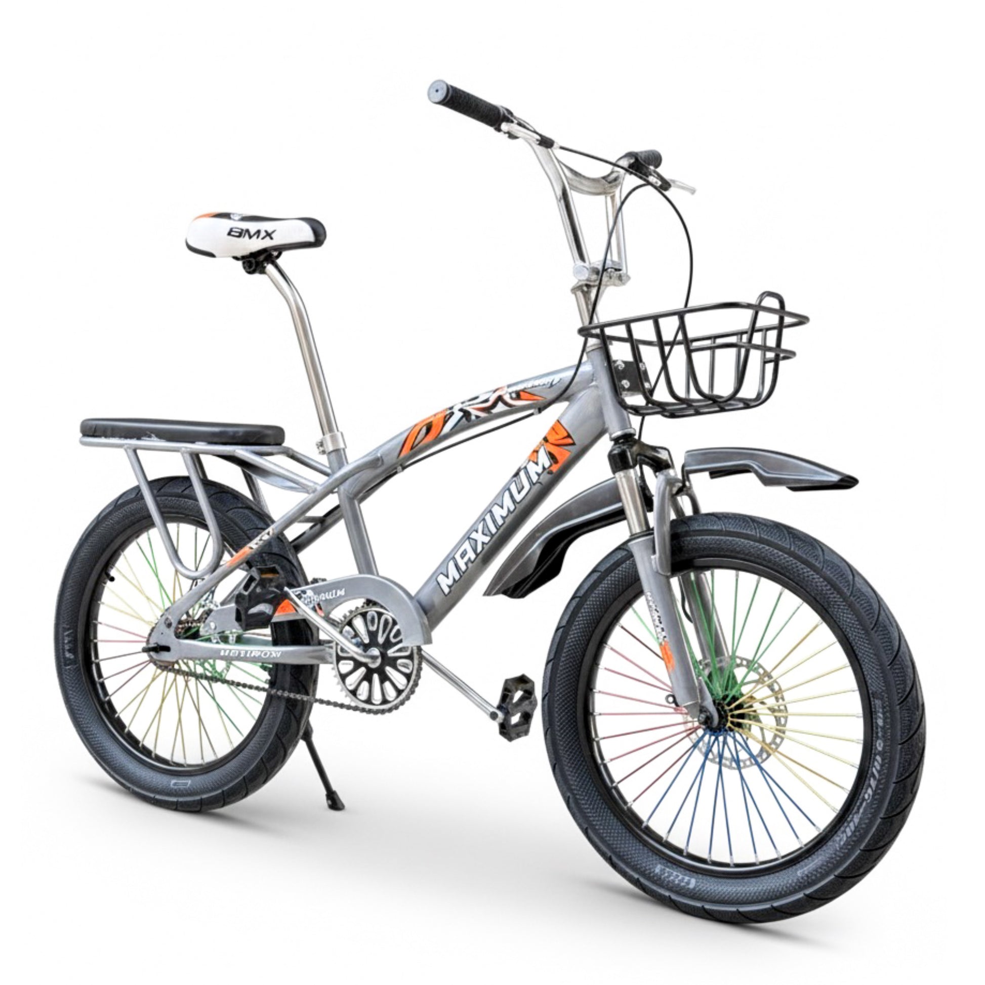 BMX 20 Inch Bike for Kids & Teens (Ages 6–15) – Front Suspension, Disc Brake, Front Basket, Color Spokes & Rear Comfortable Seat silver